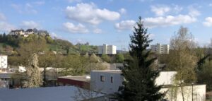 Blick auf den Bahndamm vom Dach der Tiefgarage in der Nordostecke der Überbauung «Im Lenz»