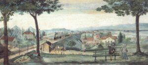 Carl Andreas Fehlmann, Blick von der Schützenmatte, beim Cholerahaus, nach Westen auf den Bahndamm; zu erkennen ist ein auf dem linken der beiden Gleise fahrender Zug mit Dampflokomotive, also ein Zug der Richtung Wohlen fahrenden Aargauischen Südbahn