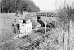 Das 1971 abgebrochene Stellwerk im Gexi. Über die im Vordergrund, vor dem Stellwerkgebäude, sichtbaren Weichen wurden die Züge des nach links abzweigenden Gleises von/nach Othmarsingen ein- und ausgefädelt. Auch die Stahl-Fachwerkbrücke der Strasse wurde damals durch eine neue Brücke aus Stahlbeton mit grösserer Spannweite ersetzt.