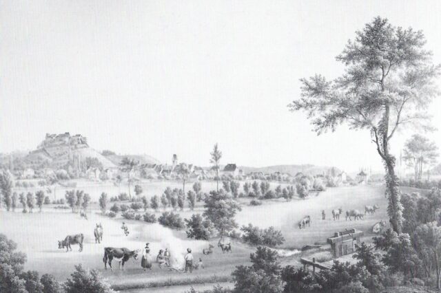 Titelbild: Sicht von Norden auf Lenzburg, von einem Standort im Bereich oberhalb der ehemaligen Wisa-Gloria-Werke; Stich R. Leemann / R., Rey