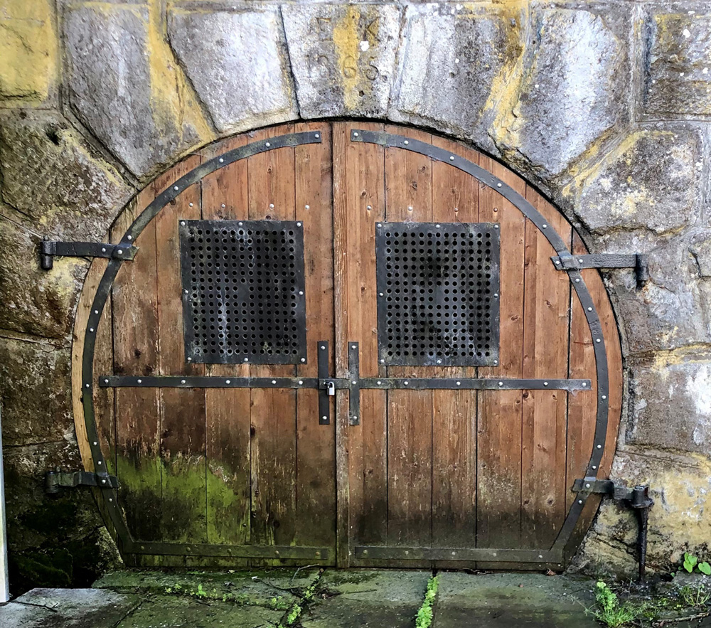 Das Tor zum Felsenkeller mit den auf dem Schlussstein eingemeisselten Initialen des Bauherrn und Baujahr