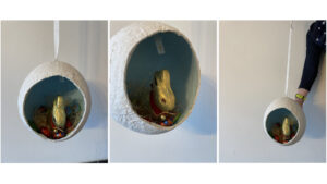 Bei schönem Wetter lassen sich die Eier-Nestchen in den Sträuchern aufhängen. Viel Spass beim Nachbasteln, Verstecken und hoffentlich Mitnaschen.