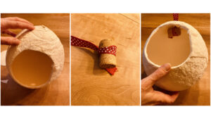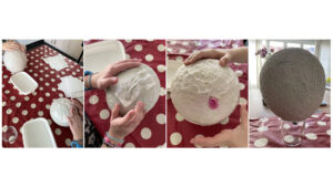 Ist der ganze Ballon ausser am Knoten ummantelt, beginnt man mit der zweiten Schicht, dritten Schicht, bis mindestens zehn Schichten auf dem Ballon liegen. Zum Schluss sollte man die Ummantelung nochmals etwas anfeuchten und sanft an den Ballon drücken. Jetzt kann man das Ei zum Trocknen auf einen Becher stellen. Mindestens 24 Stunden später, wenn die Ummantelung sich trocken anfühlt, kann man mit dem nächsten Schritt fortfahren.