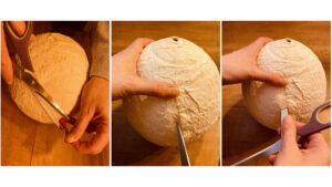 Man hält den Ballon nun so vor sich, dass der Knoten nach oben zeigt und zerschneidet den Ballon am besten an dieser Stelle. Durch dieses Knopfloch zieht man am Schluss das Seidenband, damit man das Osterei aufhängen kann.