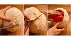 Jetzt kann man mit der Schere mittig ein Loch in die Ummantelung schneiden, welche dann als Öffnung für die Ostersachen dient. Dabei sollte man nicht zu tief runter schneiden, so dass man danach das Ei befüllen kann.